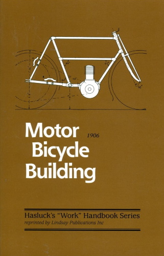 Here you get a reprint of a very scarce book from 1906. Back then if you wanted a motorcycle, you had to build one. From scratch! You get the details on building a 3-1/2 hp engine (3-1/2" bore x 2-1/2" stroke) around which you build a bicycle frame. It's not speculation. This is a motor bicycle that was actually built and probably terrified the local gentry. Most of the book deals with the castings that form the joints in the frame, and the fabrication of the engine itself. And that means lots of detail in fabricating the piston, connecting rod, muffler, points, cams, valves, spray carburetor, ignition coil, and all the rest.
